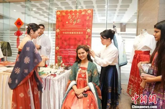 当地时间2024年1月17日,“有一种叫云南的生活·年味儿”图片展正在孟加拉国南北大学展出。图为观众体验中国春节文化。中新社发 云南省人民政府新闻办公室 供图