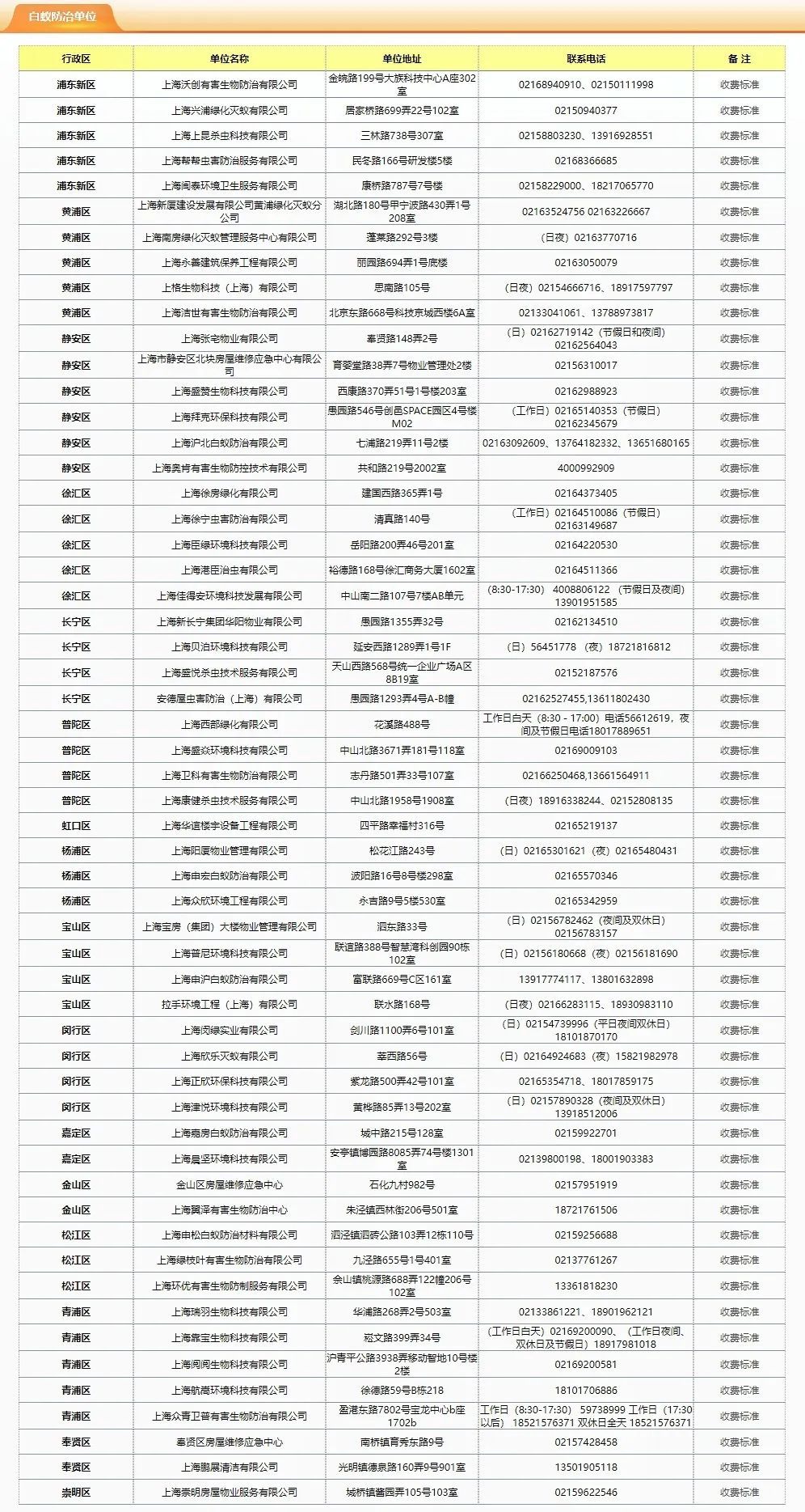 市物业管理事务中心介绍,近期,随着本市气温逐步回升,白蚁也开始躁动起来。在温度相对适宜、空气中的湿度较大时,白蚁就会出飞。本市常见白蚁种类主要有家白蚁和散白蚁两种,每年三四月份是散白蚁出飞季,五六月份则是家白蚁出飞季。白蚁会带来哪些危害,应该如何进行防治?详见↓ 01 白蚁,是一种对木材有极强破坏力的昆虫。它们以木材为食,不仅会在木材内部筑巢繁殖,还会分泌出酸性物质腐蚀木材。如果不及时发现和处理,白蚁的侵害将导致房屋结构受损、家具变形、书籍纸张被蛀蚀等严重后果。 02 如果发现家具、地板木材或墙壁表面有泥状分泌物(俗称“蚁路”)或细小的孔洞,很可能家中有白蚁入侵了。同时,如果在房屋内发现浅黄色或浅褐色、呈颗粒状的白蚁排泄物,要引起警惕。 03 居民如发现白蚁从屋外飞入室内,应立即关好门窗,用盛水的盆放在灯下,使白蚁跌入水中淹死。如果白蚁是从家中飞出或无法判断白蚁来源,应及时联系白蚁防治企业,让专业技术人员上门处理。同时,要妥善保护好蚁害现场,不要盲目自行消杀,扩大危害范围。 04 保持干燥通风 白蚁喜欢潮湿的环境,因此保持房屋干燥通风是预防白蚁的关键。 保持干净整洁 经常打扫房屋,消除一切能诱集白蚁的垃圾废品,保持室内环境干净整洁。 切勿堆放杂物 楼梯及阴暗角落不堆放杂物,室外场地尽量不堆集枯枝、废弃物或建筑木材。 定期检查房屋 定期检查房屋内的木材,特别是木质家具、门窗等易受潮的部位,一旦发现白蚁活动痕迹,要及时处理。 提前加装纱窗 每年月3至7月为本市白蚁繁殖期,建议加装纱窗,防止白蚁飞入家中。 寻找专业人士 发现疑似白蚁活动迹象,及时向专业人员进行咨询、检查和处理。 05 微信小程序 01 注册登录“随申办”小程序,在搜索服务事项栏中“白蚁防治单位”,可按行政区查询白蚁防治企业。 02 注册“上海物业”小程序,绑定小区后,可在“上海物业”小程序“寻找服务”菜单中的“白蚁防治企业”名录中查询白蚁防治企业的联系电话、收费标准等。 电话 拨打12345市民热线、962121物业服务热线进行咨询。 网站 查找“上海住宅物业网”(https://962121.fgj.sh.gov.cn),点击“白蚁防治”栏目,查询白蚁防治企业的联系电话、收费标准等。目前,本市16个行政区都有白蚁防治企业,市民可以根据实际情况,就近选择白蚁防治企业进行上门灭治。如发现白蚁防治企业有未按公示的收费标准乱收费的,可拨打962121热线进行投诉。 点击查看大图↓ 白蚁企业名录