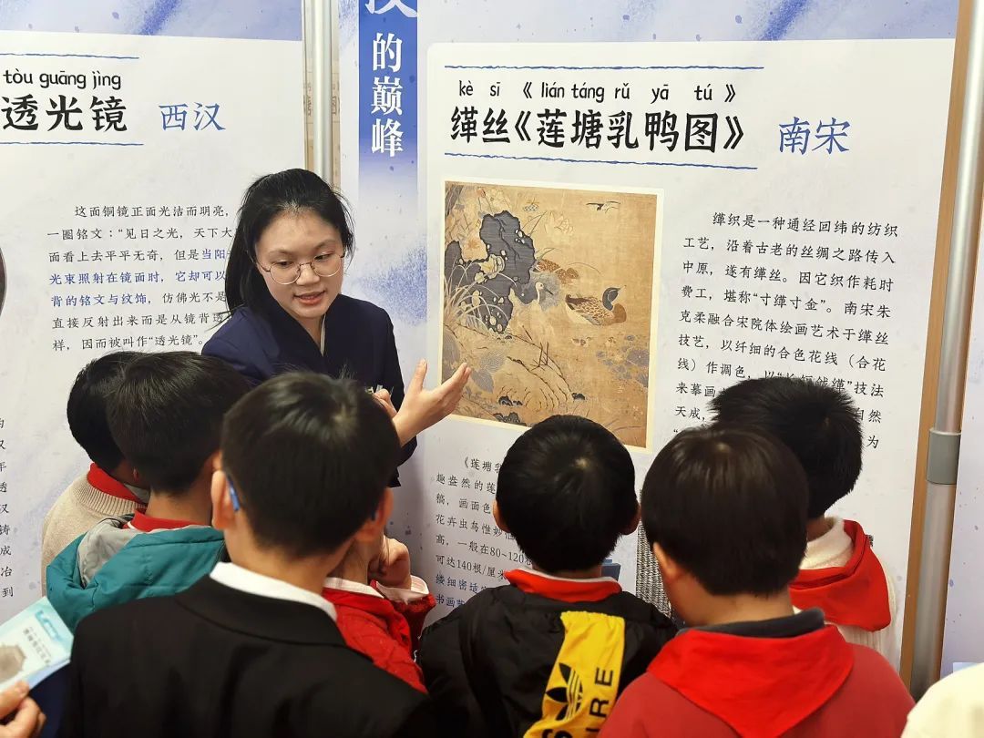 为让学生的观展体验更深刻、更有收获,学校与上海博物馆合作设计了项目化学习单,不仅对学生观图文展前、中、后三阶段的教育活动进行设计规划、实践指引和全程记录,还引导学生运用智能技术工具自主学习、创新实践。除了图文展览,讲座分享、图文展导览、学生艺术工作坊、AI互动设备体验、游戏活动等配套教育活动也在校内同步开展,进一步激发了学生对探索新知的热情。