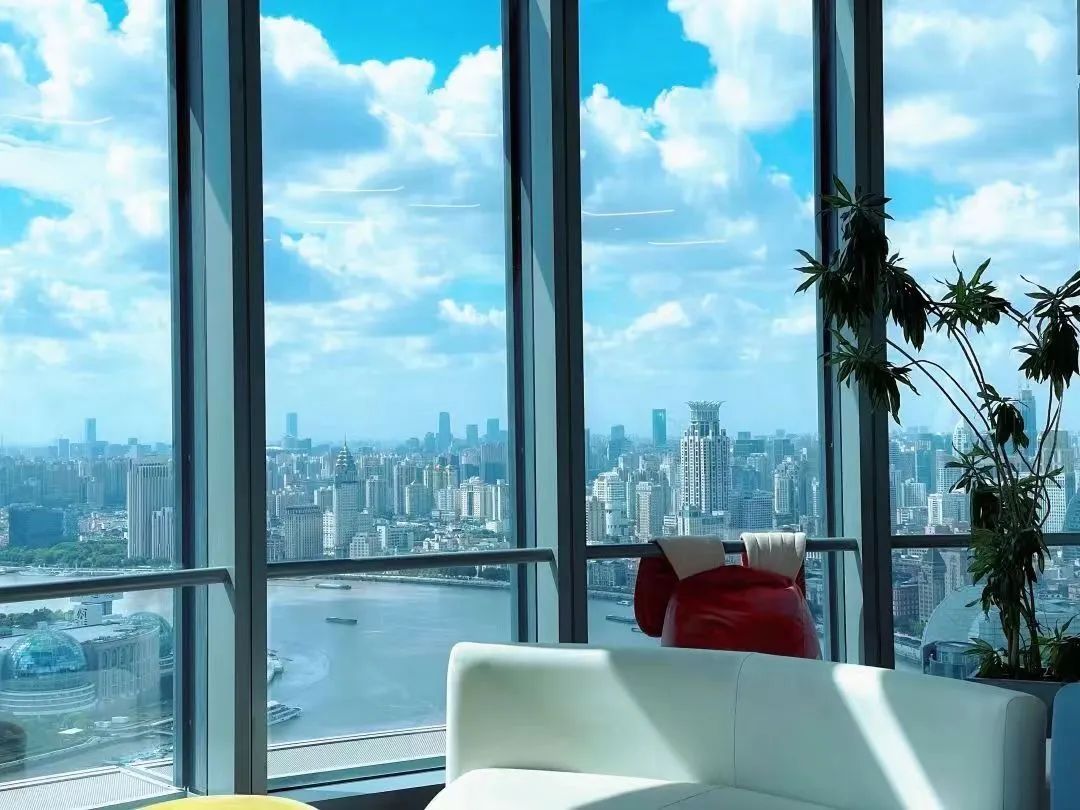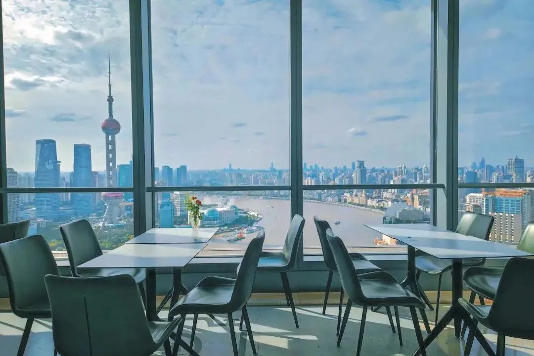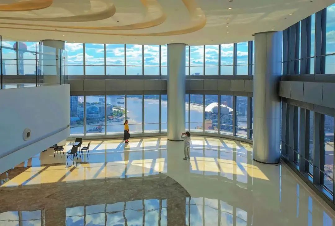 在白玉兰广场L层空中大堂,透过高楼玻璃捕捉两岸风光,是与众不同的视角。在这里看夕阳,更是氛围感十足。