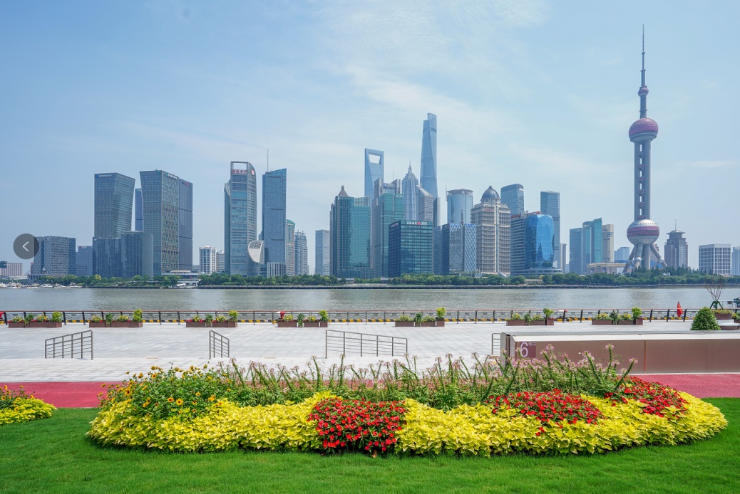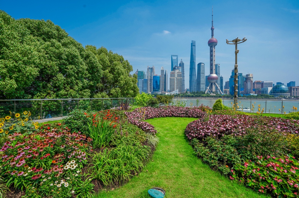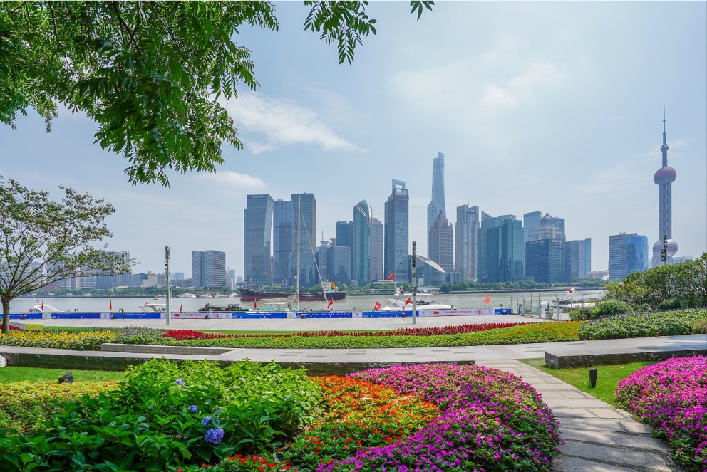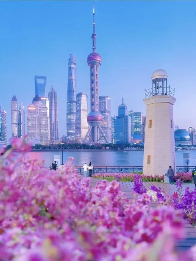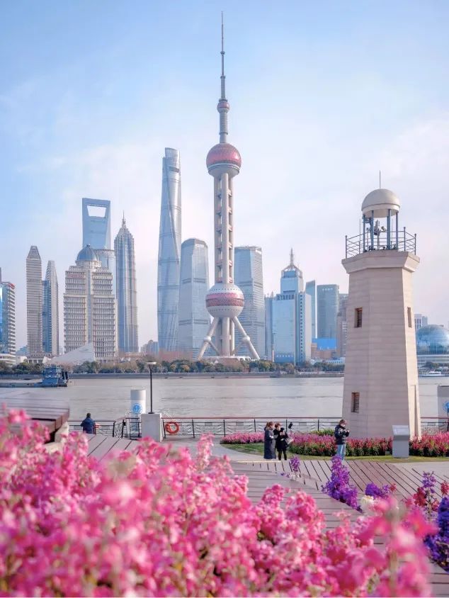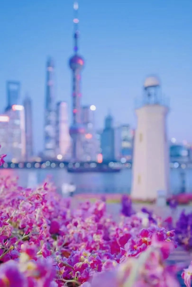 花朵小巧密集,花瓣在阳光下闪烁着柔和的光泽,微风轻拂掀起层层波浪,与对岸的魔都天际线相映成趣。