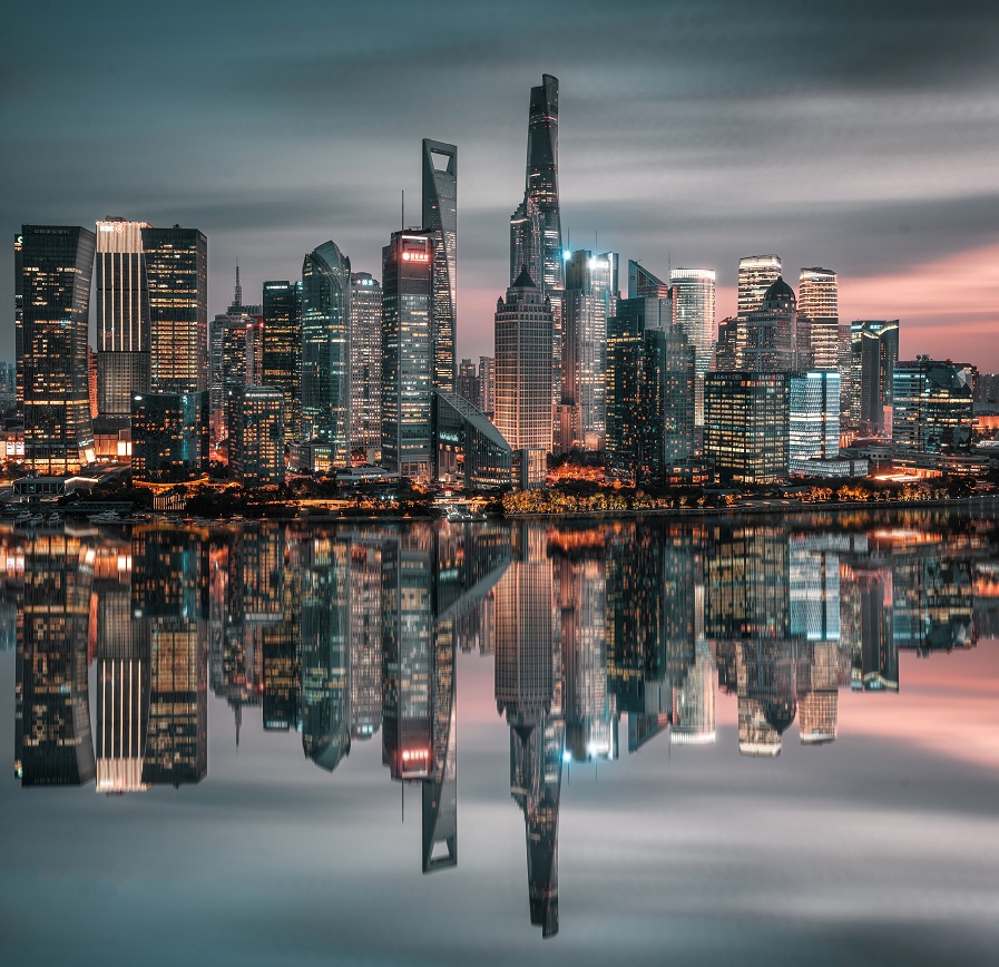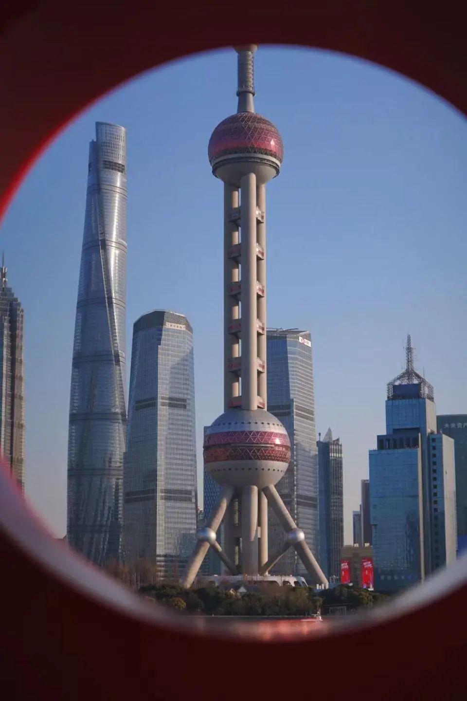 四款不同颜色的金属材质反光镜面被安装在观景平台的栏杆扶手处,将镜头贴近镜面,就是一张“魔都镜像”风光大片。