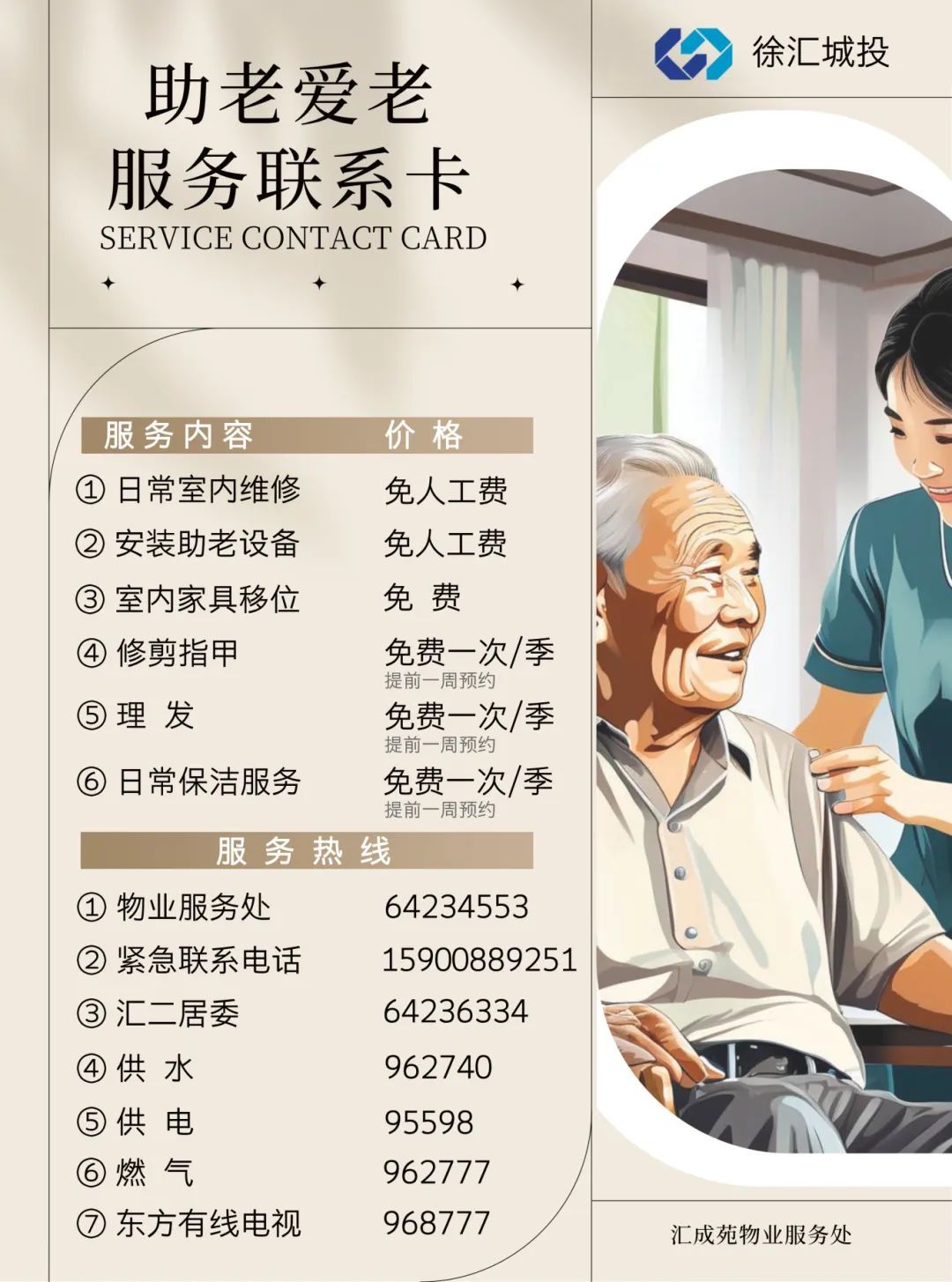 针对小区老年人较多,养老需求大的问题,汇成二村居委会、业委会聚焦徐汇区推行的“物业+养老服务”新模式,通过社区微网格员配合汇成物业,对小区里每一位高龄独居老人进行多次走访,谈心谈话,为老年人建立了“一户一档”健康档案,了解独居老人的健康状态、生活自理能力、需求等,及时更新老人信息,还为老人定制助老爱老服务联系卡,老人只需要拨打电话,即可享受到修剪指甲、理发、定期上门保洁、小家电维修等6项贴心服务。