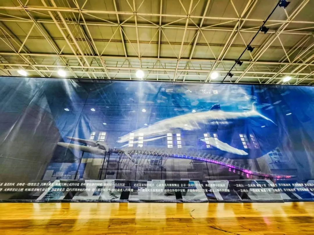新学期伊始,上海科技馆首次将这件珍贵馆藏搬出博物馆,将其陈列在学校二楼体育馆,占据了近三分之一的空间。此外,体育馆及走廊内布满了与长须鲸相关的展览内容,吸引了众多嘉宾驻足观赏。