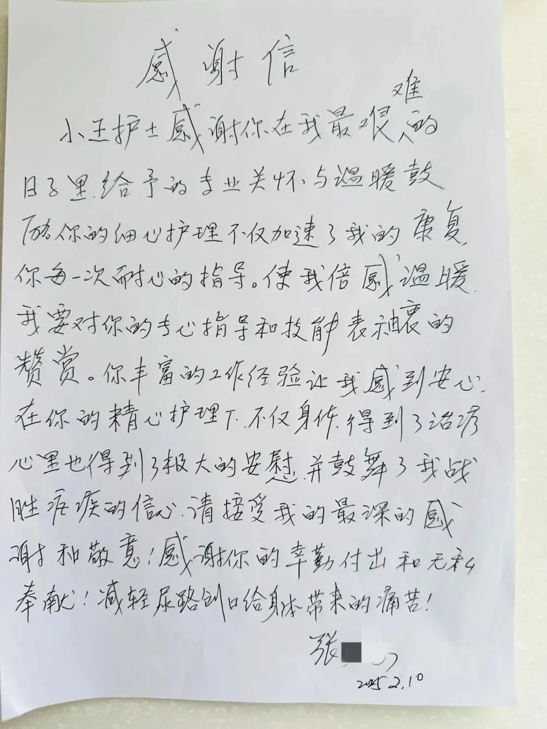 宝山区张庙街道泗塘社区卫生服务中心伤口护理团队始终坚持“每一道伤口,都是我们的使命必达之处,誓做健康守护者”理念,她们用专业精心呵护着每一处伤口,只为社区居民重绽健康笑容。 当晨曦穿透护理中心的玻璃窗,一封手写的感谢信安静地躺在护士站台面上。泛黄的信纸上,患者张先生用颤抖的笔触记录着伤口愈合过程中感受到的“家人般的温度”。这封简短的信件,不仅是一份感动,更彰显出社区护理人员在基层医疗高质量发展中迸发的独特价值。 张先生家属当得知中心开设伤口造口护理门诊后即前来咨询,护理中心专科护理人员热情接待,详细讲解了关于造口护理的预约流程和注意事项。患者张先生出院后第一时间来到护理中心,造口专科护士王小丽为患者清洁造口周围皮肤,更换造口底盘,安装造口袋,做好健康宣教和生活指导。她在护理过程中,细致地为患者讲解了尿道造口的日常护理知识,耐心解答了各种疑问,手把手指导如何正确进行自我护理。她用专业的态度和精湛的技术让众多患者对康复充满信心,帮助他们更好地适应了尿道造口的生活,对未来的康复之路充满希望,赢得了患者及家属对她多次赞扬和肯定。 一纸表扬信,承载着社区居民的深情厚谊,也记录着伤口护理门诊的成长足迹。未来,护理中心将继续以匠心雕琢服务品质,以仁心温暖社区每一个角落,为社区健康事业注入源源不断的活力,让社区成为充满健康与幸福的温馨家园。