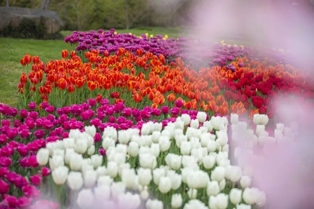 粉色烂漫、红色逸雅、黄色明媚……的郁金香,花姿优雅、色彩缤纷,亭亭玉立、温柔端庄,花香阵阵、沁人心脾。田野间,油菜花铺就一片灿烂的金色海洋,微风拂过,花浪层层翻涌,浓郁的甜香扑鼻而来。