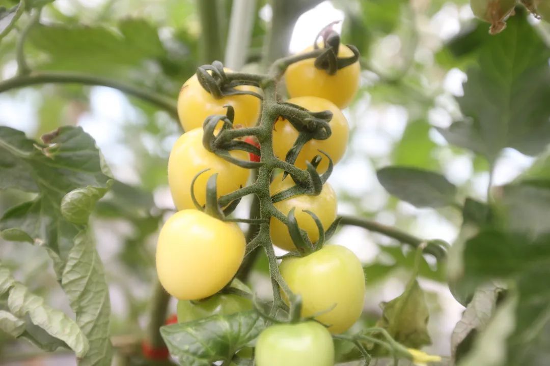 “这是今年刚引进的新品种‘白妃’,口感上是九分甜一分酸。”幸运草莓园负责人刘冬梅小心托起一串果实介绍道,与普通番茄不同,“白妃”果实呈饱满的椭圆形,成熟过程中会经历从青绿到鹅黄,最终转为乳白色的渐变过程,部分接近成熟的果实表面还透着淡淡的黄晕,像裹着层薄纱。