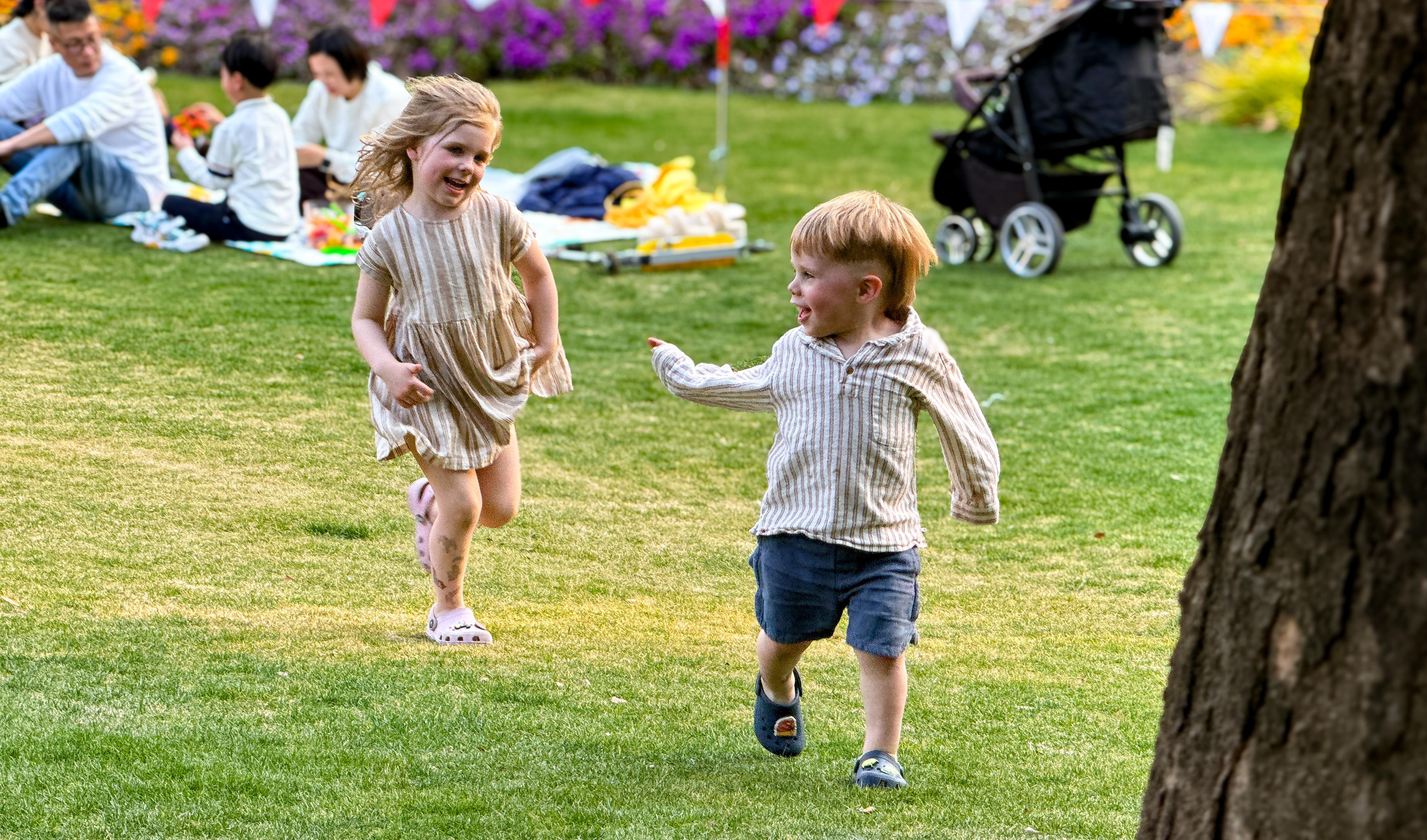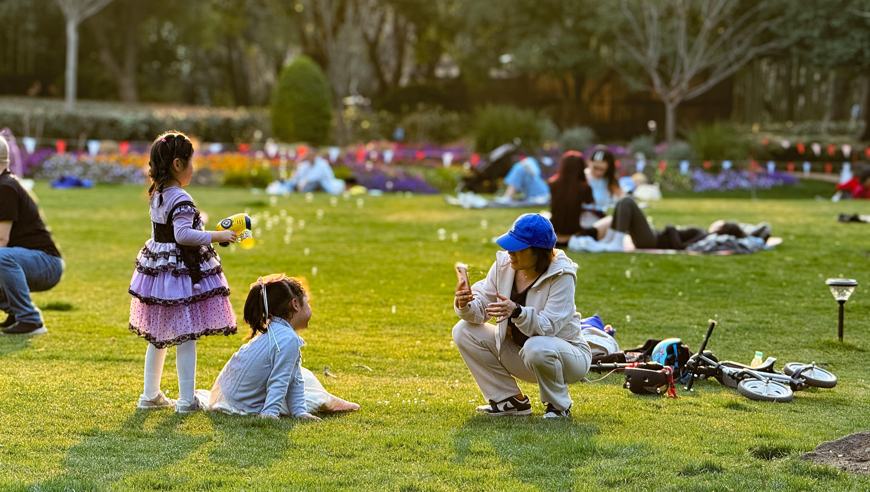 草坪上早已人头攒动。小朋友们像脱缰的小马驹,在草地上嬉笑奔跑,银铃般的笑声在空气中回荡。大人们则三五成群,惬意地坐在野餐垫上,一边沐浴着温暖阳光,一边分享着精心准备的美食。