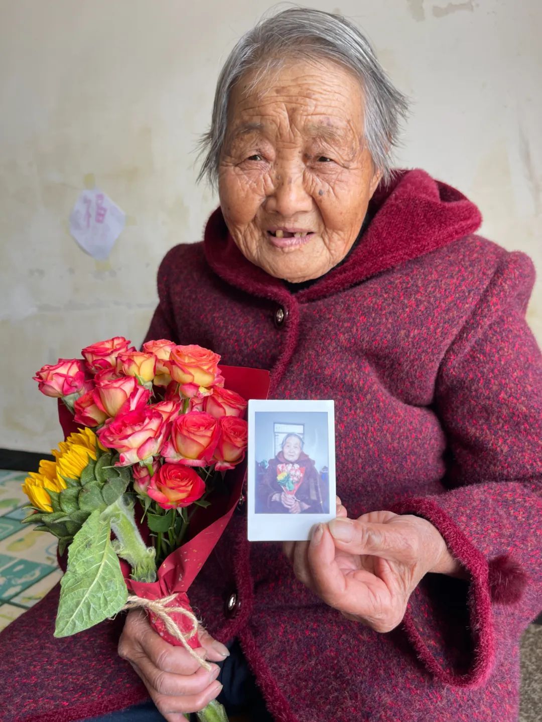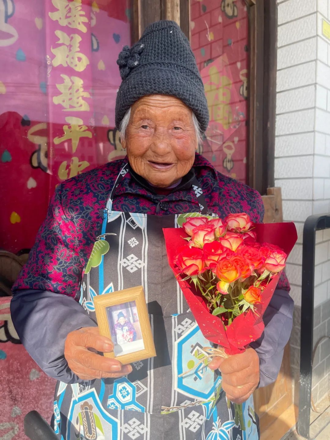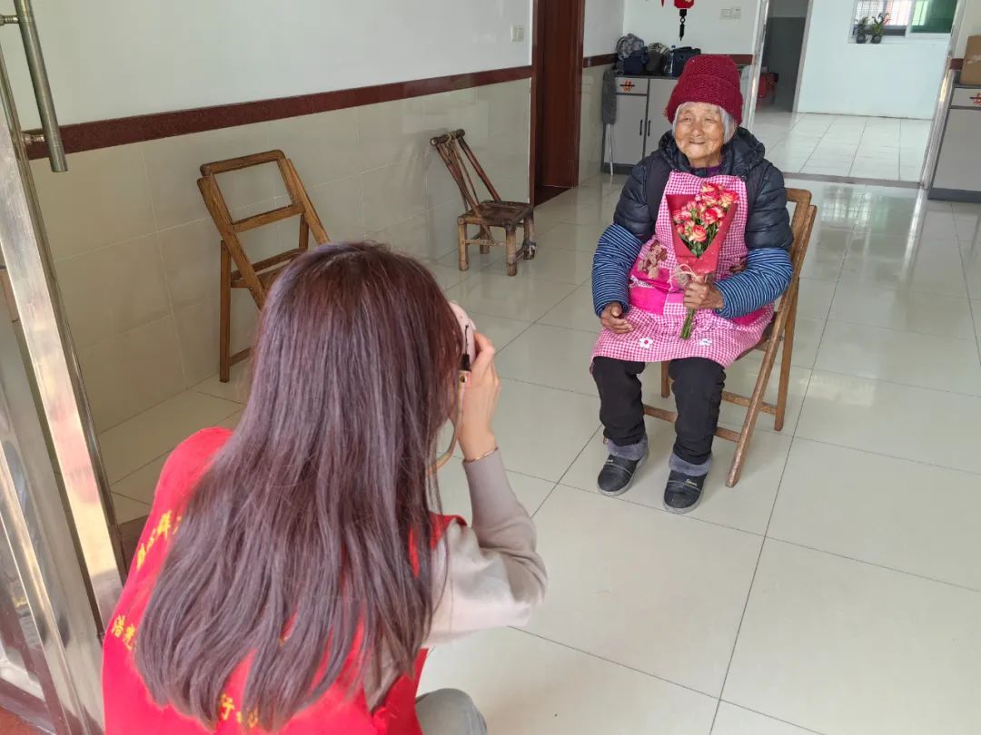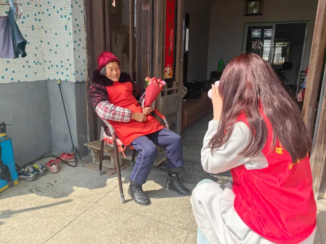 当天,浩光村志愿者团队精心准备鲜花、拍立得相机及相框等物资,前往全村30位高龄老人家中,为老人们献上象征祝福的鲜花。伴随着快门的“咔嚓”声,一张张饱含岁月印记的笑脸被即时定格。拍摄完成后,志愿者现场将照片装裱进相框,交到老人手中。