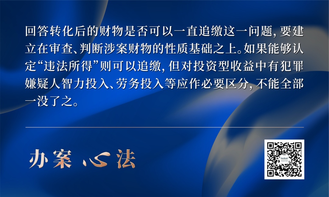 笔者认为,从罗马法时代流传至今的法谚——“任何人不能从犯罪行为中获益”原则的底层逻辑分析,犯罪所得的收益转化、转变后均应作为违法所得予以没收,否则会出现鼓励犯罪者从事或者继续从事违法犯罪活动的结果。在司法实践中,回答转化后的财物是否可以一直追缴这一问题,要建立在审查、判断涉案财物的性质基础之上。如果法院能审查、判断出追缴的财物属于“违法所得”,则可以追缴,不限于财物属性、种类等发生的变化。比如,将违法所得的钱款转化为房产,再将房产出售,出售房产的钱款仍然是违法所得。而对投资型收益不能无限制地追缴下去,像对人之诉一样,对物之诉也要遵循罪责刑相适应原则,对于投资型收益中有犯罪嫌疑人智力投入、劳务投入等要予以必要的区分,不能全部一没了之。