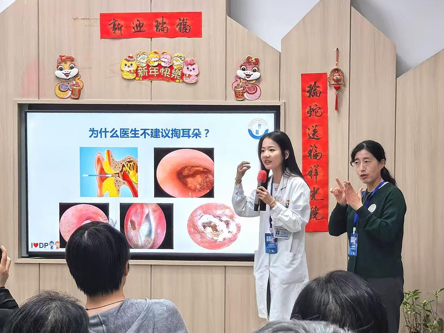 打浦桥街道社区医院医生张宁婕结合临床经验,系统讲解护耳核心知识:“三禁忌”——避免棉签掏耳、杜绝双侧暴力擤鼻、禁止非专业处理耳进水;“实用干预”——高空耳闷可通过捏鼻鼓气缓解,老年性聋需警惕高频听力损失,强调助听器须经标准化验配流程。结合耳蜗毛细胞显微图示及听骨链模型,深入阐释声波传导机制,凸显“早诊早干预”的重要性。