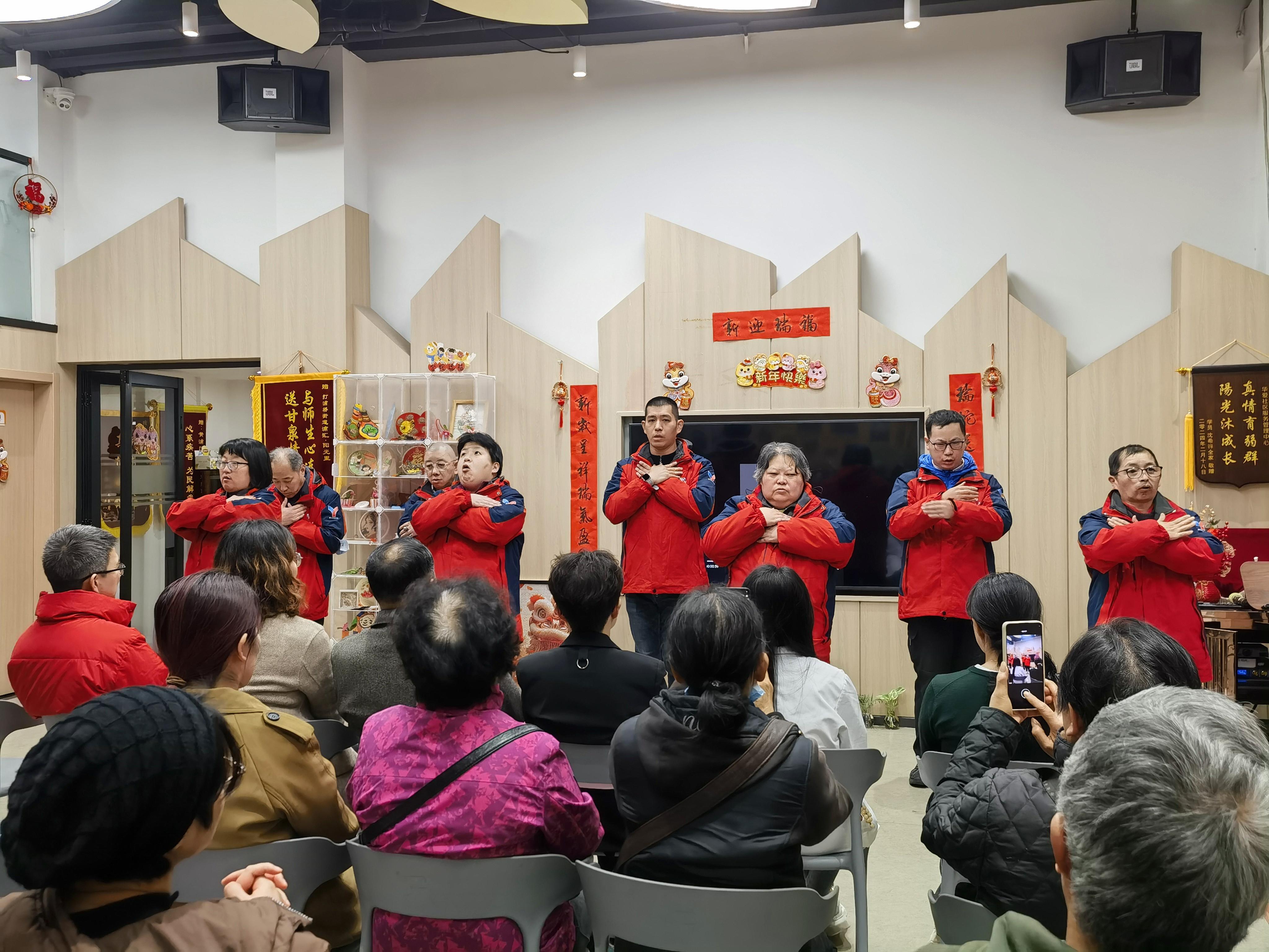 打浦桥街道阳光之家的学员们以整齐划一的手语动作演绎了经典旋律《感恩的心》。
