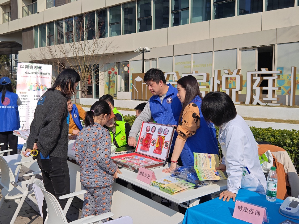 活动现场,绿色理念与便民服务交织成独特风景。便民修补摊位前,居民排起长队,志愿者巧手缝补衣物、修理小家电,让“修旧如新”的无废城市理念深入人心;健康义诊专区则化身“健康加油站”,医护人员为居民量血压、测血糖,并结合春季流行病特点科普养生知识。“没想到租房社区能有这么丰富的活动!既学到了实用的法律知识,还兑换到了绿植盆栽,感受到‘家’的温暖。”青年租户单女士笑着举起兑换到的绿植盆栽,直言“像过节一样热闹”。