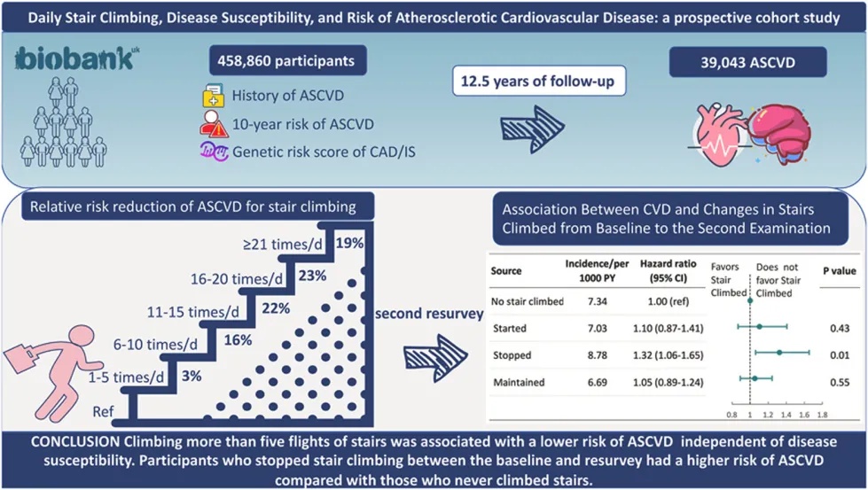 爬楼梯既能提升心肺功能,又能增强臀腿的肌肉力量。研究发现,与不爬楼梯的人相比,每天爬5次(一次10步)以上楼梯的人,患动脉粥样硬化性心血管疾病的风险降低约20%。