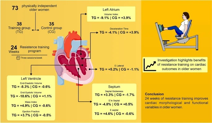 2024年刊发在《老年科学》期刊的一项研究,揭示了抗阻训练不仅能增强肌肉力量,还能显著改善老年女性的心脏形态和功能。