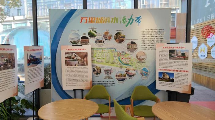 咖啡店的一隅展示着“万里城滨水活力带”地图,你可以从“桃源漫道·万里比邻党群服务站”出发,沿着滨水活力带慢行,感受兼具经典阅读、灯光艺术、智慧健康、公共服务等21个功能于一体的宜游宜行宜赏的“生活秀带”。