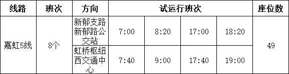 此次新开辟的嘉虹5线,将进一步提升区域地面公交线网密度,填补真新街道区域与虹桥综合交通枢纽间的地面公交线路不足。线路全长约15公里,单程行车时间约30分钟,计划采用49座大型客车以快线模式运营,线路起讫站分别为真新街道的新郁支路新郁路公交站和虹桥枢纽西交通中心。