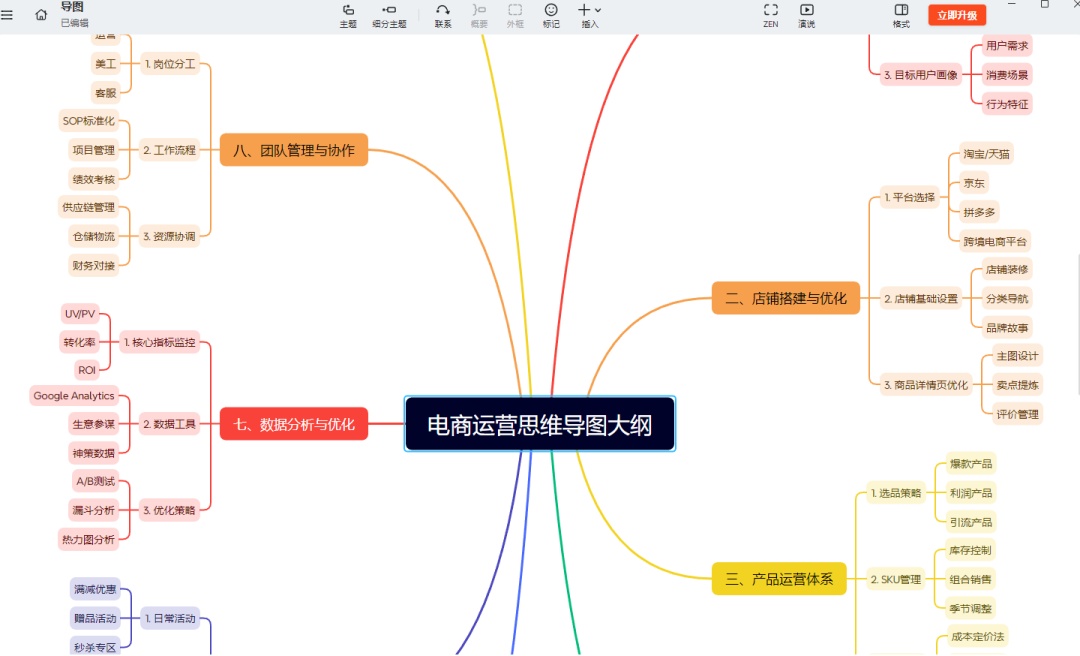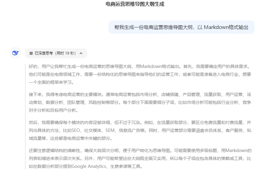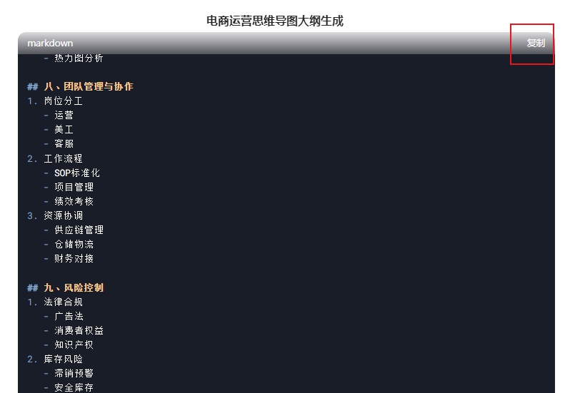 若依主题生成,在输入框输入主题,比如“帮我生成一份电商运营思维导图大纲,以 Markdown格式输出”。