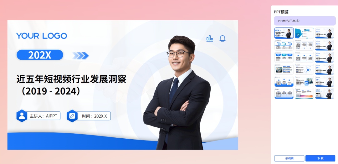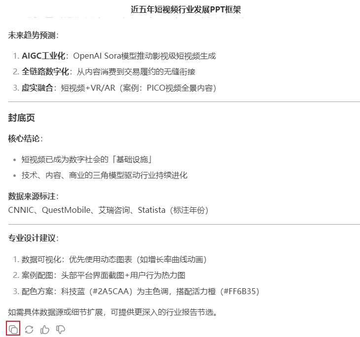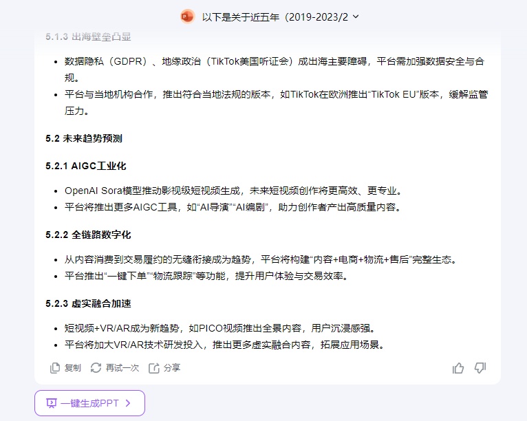 比如,“我要写一个主题为近五年短视频行业发展的PPT,注意生成结果的专业性、准确性、时效性”。