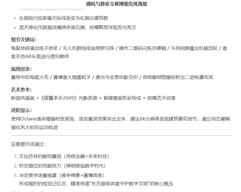 在DeepSeek里详细描述海报需求,比如“生成哪吒来到静安寺的海报提示词”。点击生成,若效果不好,调整输入内容,直至得到满意提示词并复制。