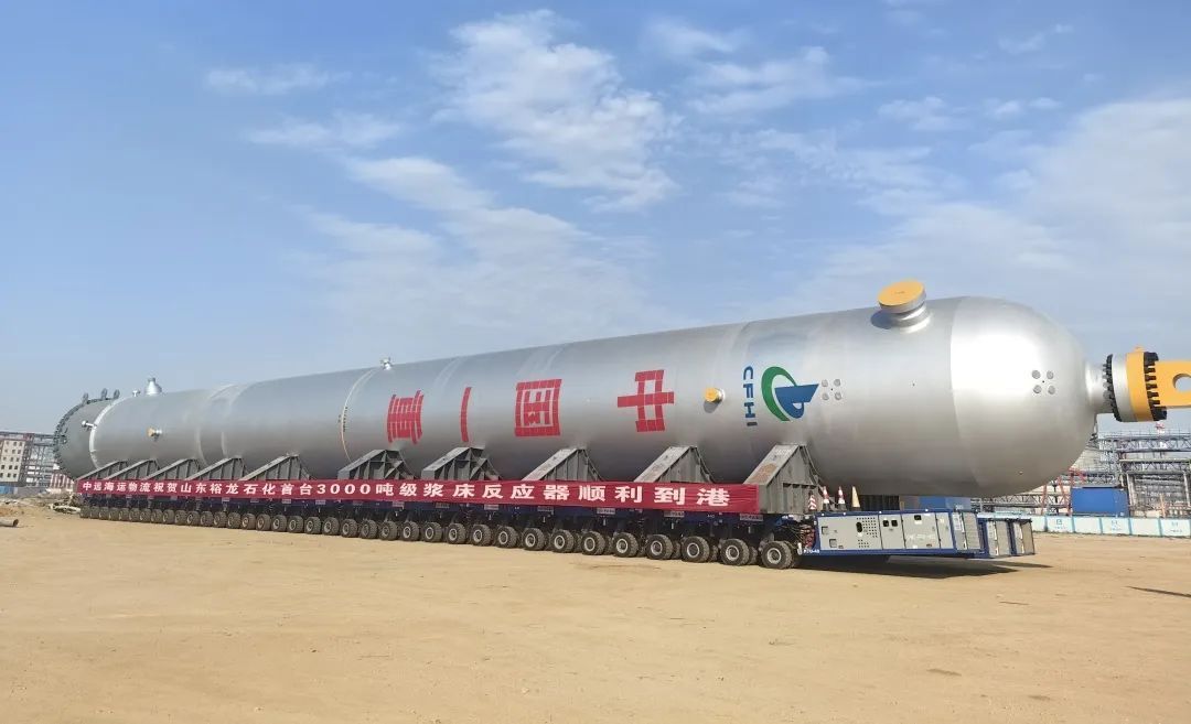 裕龙岛炼化一体化项目核心设备3000吨浆态床反应器:运输的浆态床反应器运输总重约3300吨,长66米,宽11米,直径6.2米,由于设备尺寸、重量较大,为确保设备的安全性和稳定性,项目部充分发挥技术领先优势,经过反复计算、论证,最终确定采用6纵列36轴SPMT车辆实施运输。