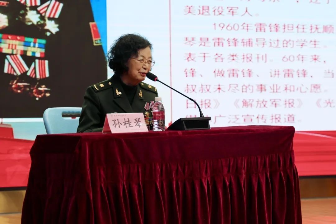“雷锋生前曾去过我的家,听到雷锋牺牲的消息,我的父母哭了。我家买了不少纸,自己动手扎了5个花圈,以代表我家五口人的悼念之情。”“一个月后,我约了同学,跑了近二十里路到雷锋墓地看望雷锋叔叔,大家摘下红领巾系到一起,连成十二条红领巾花环,献给敬爱的雷锋叔叔。”“1970年,我参军来到雷锋生前所在的部队,开启了军旅生涯,也开启了新的学雷锋之路。当战士的时候,为群众寻找失踪的小孩,为用户千里寄药;当了干部,为失足青年走上新岸洒下辛勤的汗水;当了军医,把病人当亲人,用雷锋的故事鼓励一个个年轻的战士战胜病魔。”孙桂琴老师充满感情声泪俱下的精彩报告,再次燃起了聆听者向雷锋同志学习的激情。