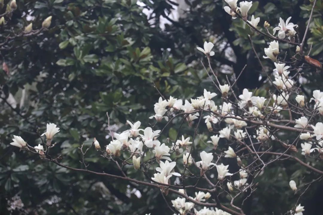 上午十时,风雨褪去,徐家汇公园的地面上留下大小不一的水洼,游客因降雨变得稀少,草木花叶却在阴雨天更显清新,在“人烟罕至”的雨后悄然绽放生机。园内的白玉兰正当其时,朵朵素白的玉兰或是含苞玉立,或是雅致盛开,于静谧中盛放自然之美。