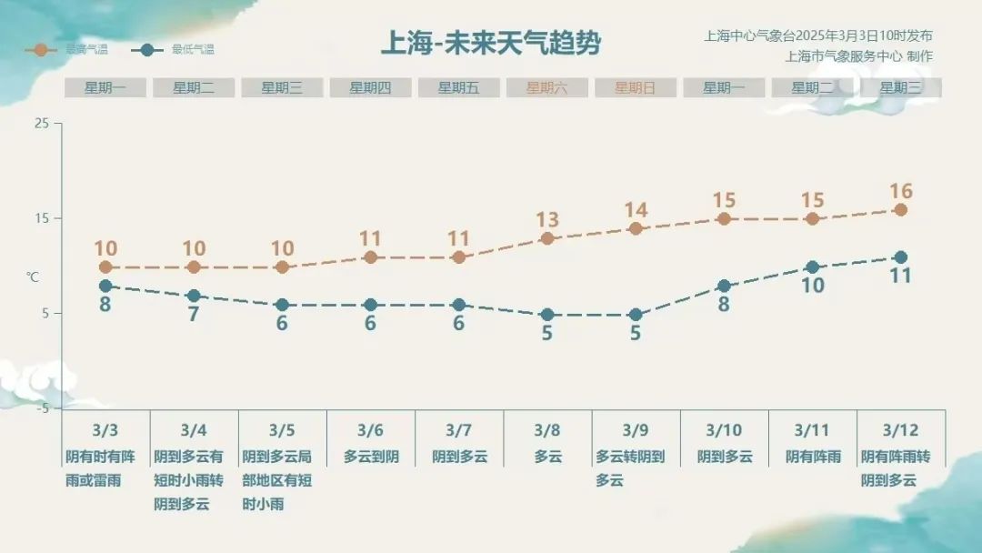 上海市气象局服务首席邬锐告诉记者:“明天开始降雨会逐渐减弱,后面几天都是以阴或者多云的天气为主,阳光并不是很好,最高气温止步于10℃左右,最低气温在6℃附近。周末气温有小幅回升,最高气温可以升到13℃左右。最近申城气温震荡剧烈,心脑血管疾病和呼吸道疾病比较高发,大家一定要注意防范。”