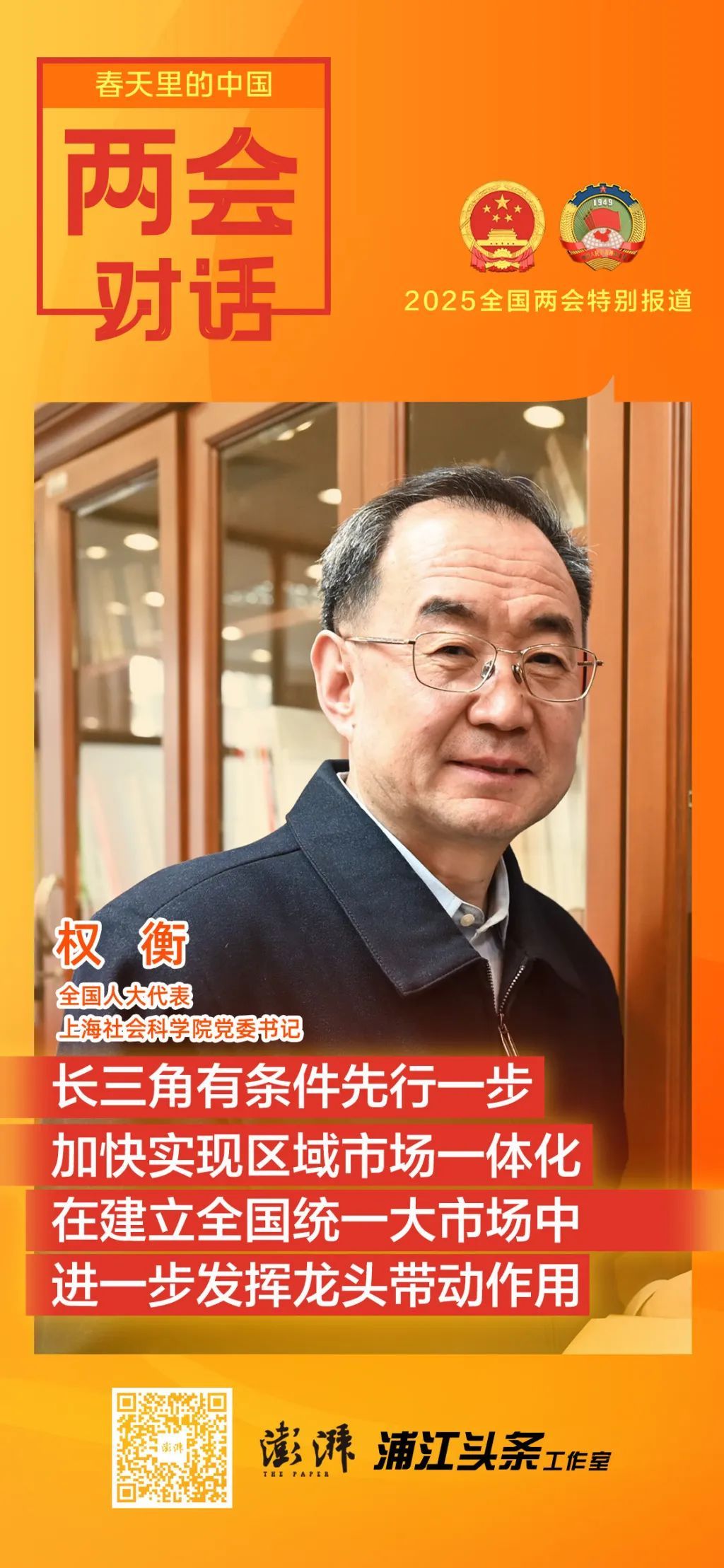 2025年全国两会前夕,权衡在接受澎湃新闻记者专访时表示,今年两会,他将持续关注长三角一体化发展,特别将着眼于破解区域市场一体化深层次难题。另外,权衡还将为提振消费进言,当前服务消费已成为消费结构升级的重要方向。