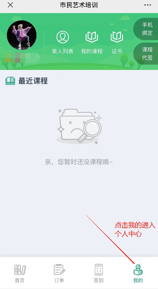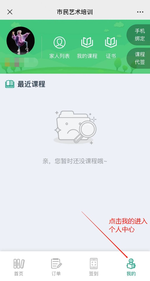 按上文方式进入“市民夜校”页面后,按需选择课程进入,点击我的→家人列表→添加家庭成员(本人信息)。