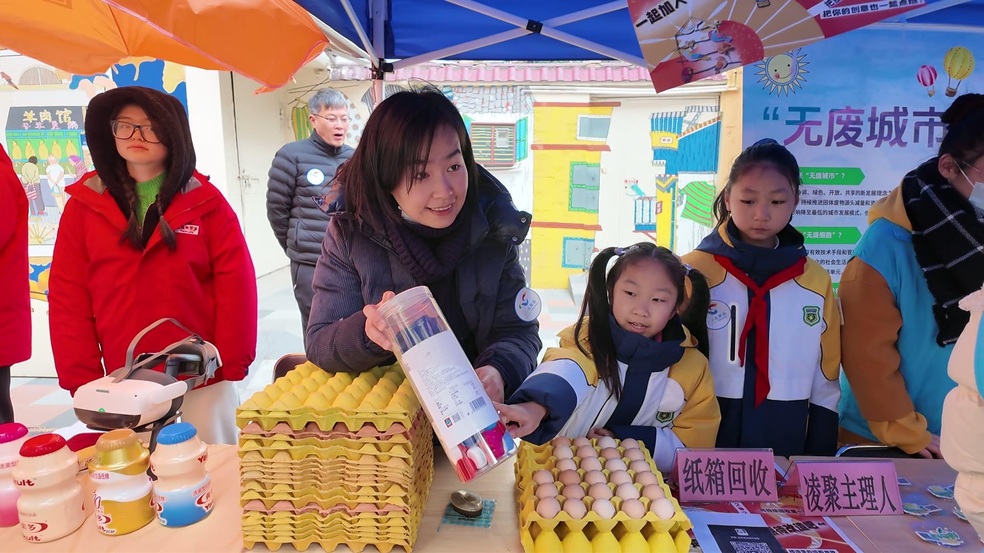 “无废城市”是一种先进的城市管理理念。本次活动,来自区生态环境局的工作人员和新凌小学的小朋友们联合设摊,通过收集纸板箱和瓶盖,来积极推行居民的环保理念,并会在后续将回收的废旧物品制作成艺术品,以达到“变废为宝”,循环利用的目的。