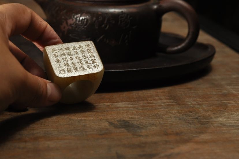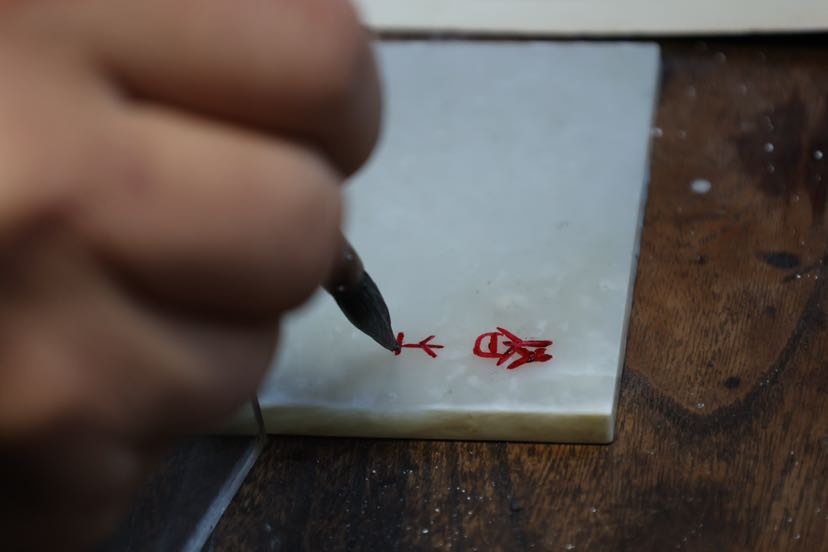 2月27日下午,在枫泾镇俞汇村的一间工作室里,俞福亮正拿着毛笔在一块白色玉石上打样,待所有的文字布局完毕后,便用工具在玉料上反复刻画。
