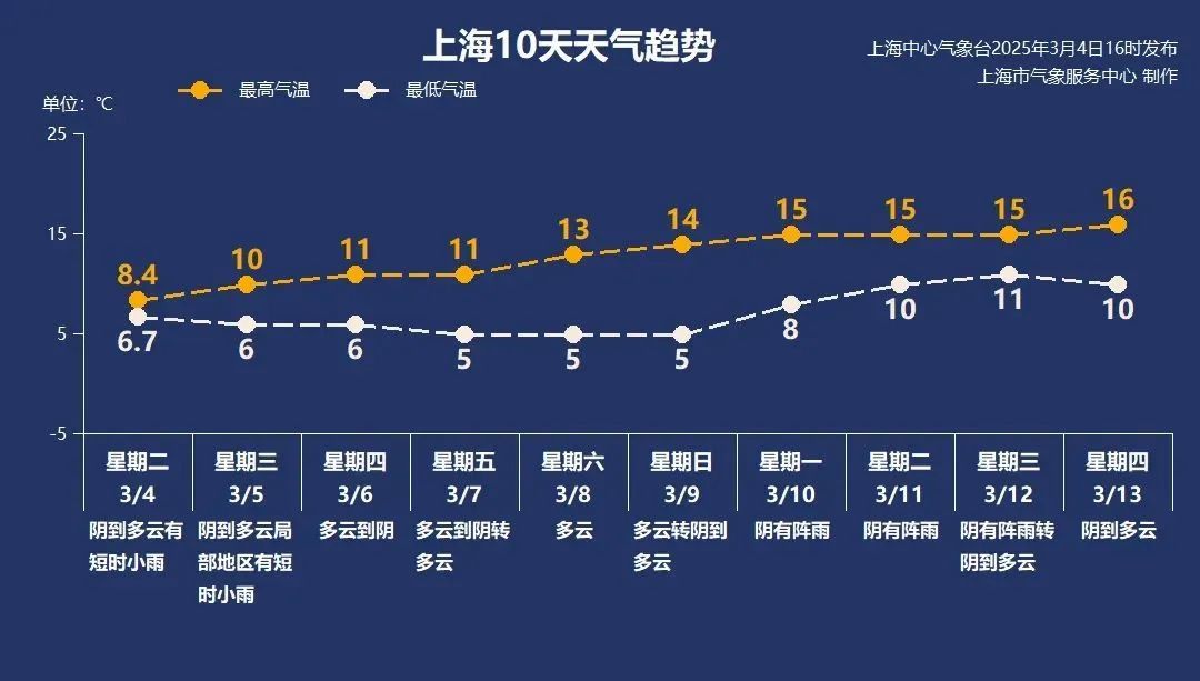 本周四至周日申城的降水告一段落,天气转为多云或阴,最高气温逐日回升,预计本周双休日最高气温将升至13~14℃,体感逐渐暖和起来,提醒大家洗晒也需抓紧。