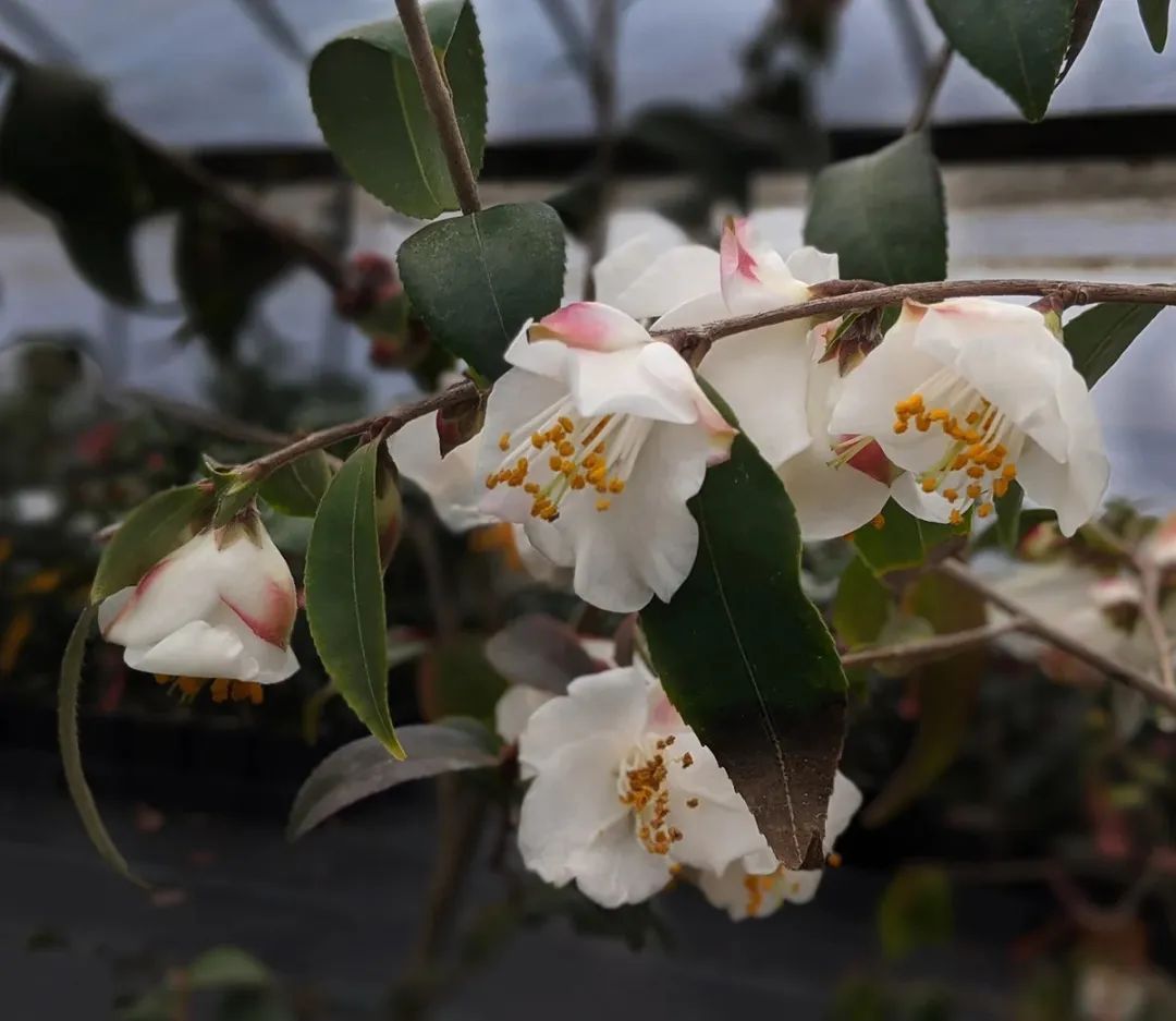 束花茶花的特别之处,不仅在花朵,从植株外观上来看,它与茶花的差异都巨大——叶片、株型都比茶花瘦小许多,枝条也更加纤细、柔软,不管花期与否,都很难将束花茶花与山茶联系在一起。那么两者之间有何联系,开着“大花”的山茶,是怎么变成“小花”的束花茶花的呢?在这背后,自然是园艺家的功劳。