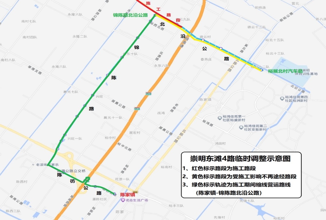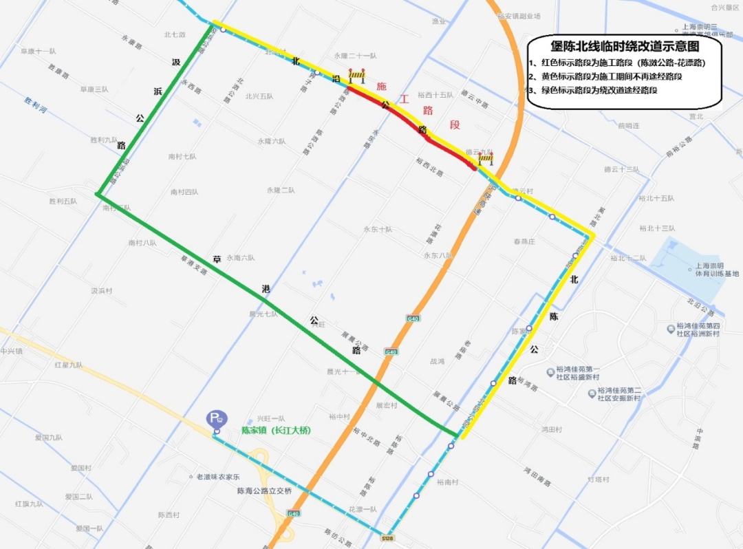 (2)改道期间临时关闭:北沿公路汲浜公路(陈家镇方向)、开港招呼站(双向)、北八滧(双向)、北沿公路锦陈路招呼站(双向)、裕西村(双向)、新出港路(双向)、老庙路(双向)、北陈公路北沿公路招呼站(双向)、裕安镇(双向)、鸿田村(双向)、窑厂(堡镇汽车站方向)共计20个站点。