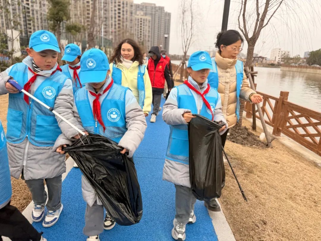 ▲工程大泗泾附校党员、团员教师与少先队员代表与社区志愿者携手,组成河道清理志愿服务队,在家乡周边社区河道开展护河行动。
