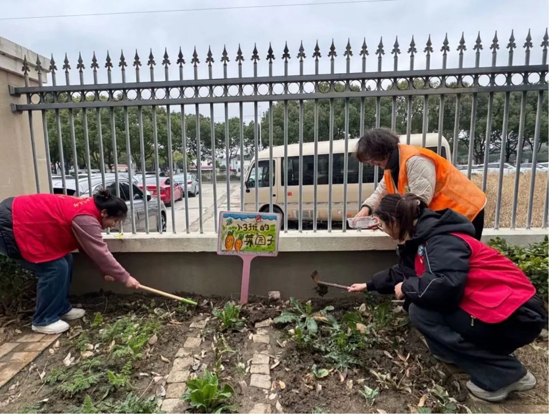 ▲九谊幼儿园策划了一场美化园所、传递温暖的“学雷锋”行动,党、团员志愿者们以满腔热忱投入到“鲜花小径”的土壤翻新、“丛林乐园”的花卉栽种以及“兔兔乐园”种子播撒等活动中。