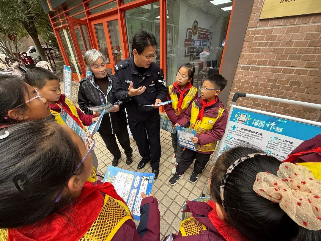 ▲泗泾二小党员教师与少先队员代表走进新凯二村,配合法院人员向居民普及反诈知识。
