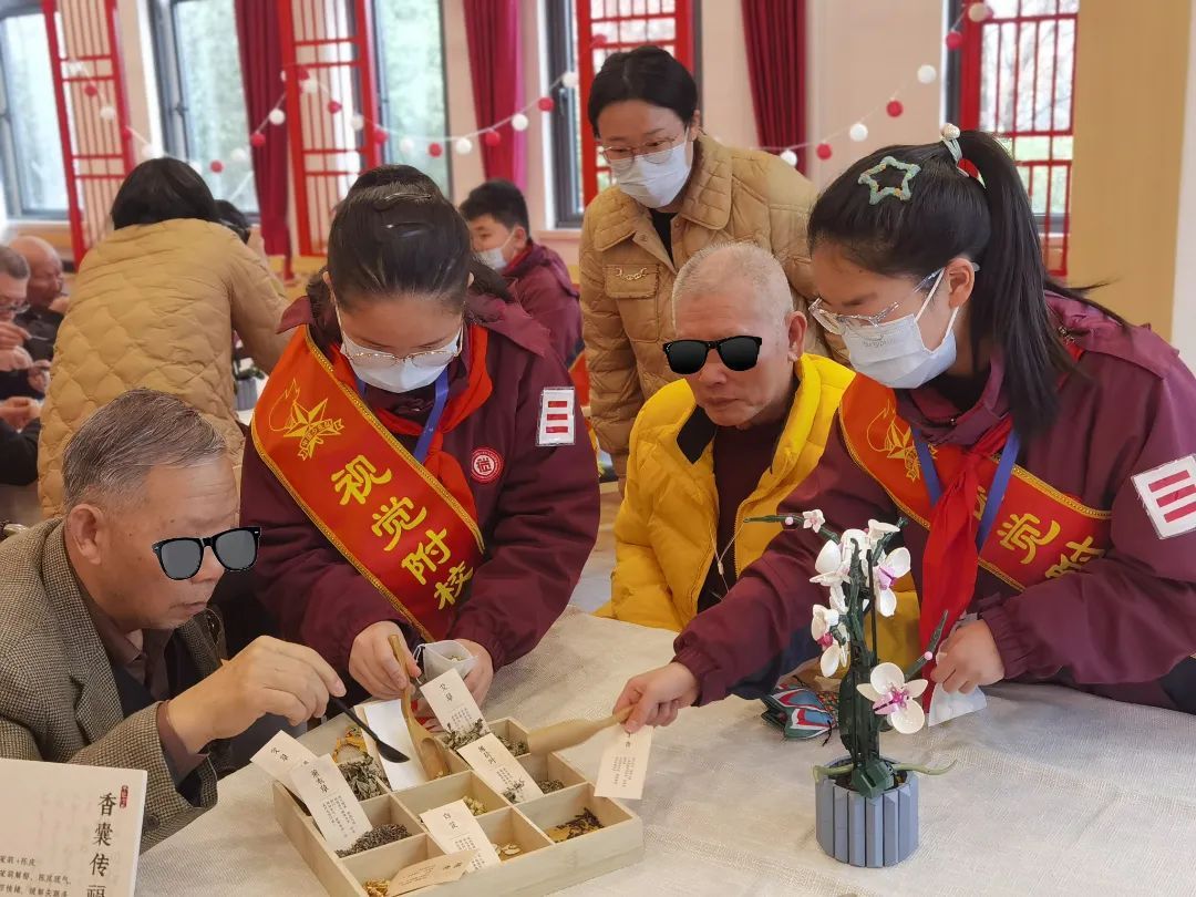 ▲视觉附校党团员教师携手少先队员们走进上海市第四福利院,耐心细致地协助福利院的老人们一起制作驱蚊虫香包,一针一线间传递着关爱。