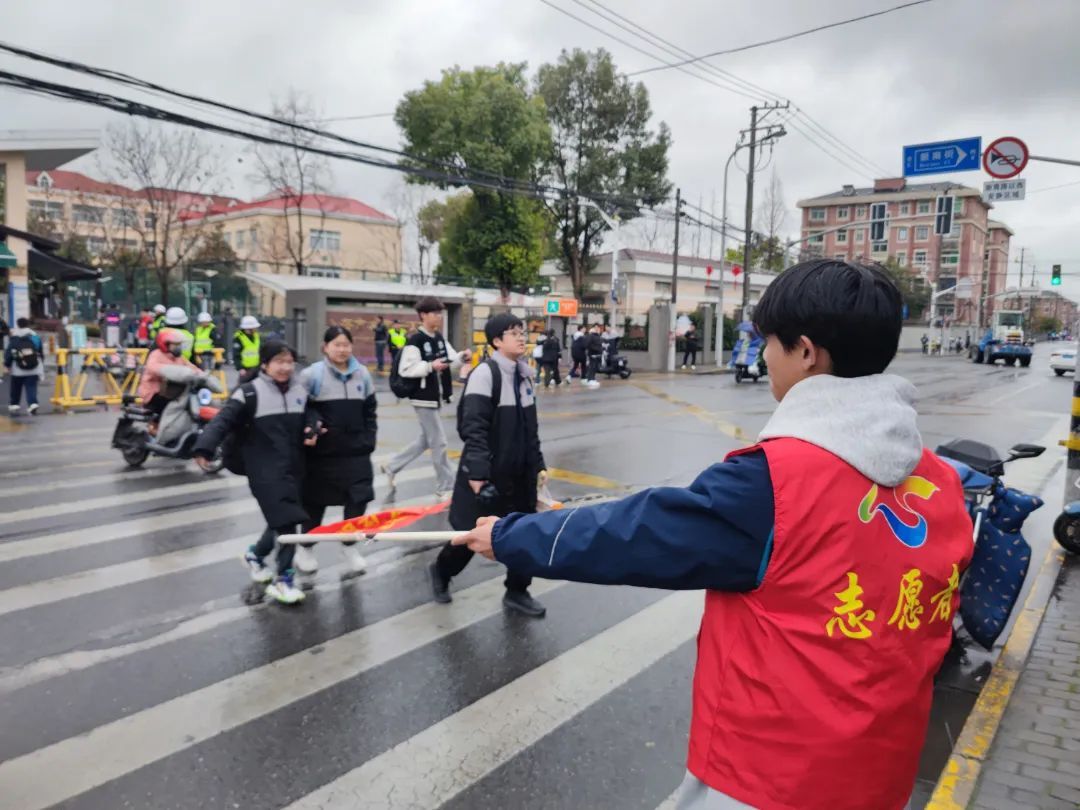 ▲城市科技学校学生志愿者参与校园交通指挥志愿服务,共同维护放学交通安全。