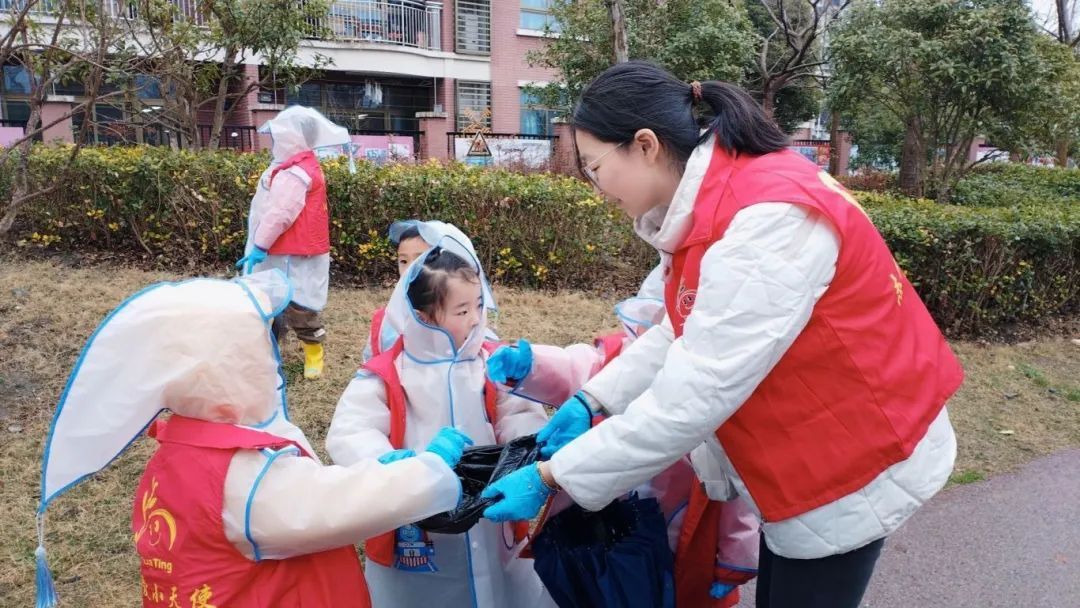 ▲华亭幼儿园党团员教师带领大班幼儿走进社区开展环保行动,师生一起清理永丰城市公园的纸屑、塑料等废弃垃圾。