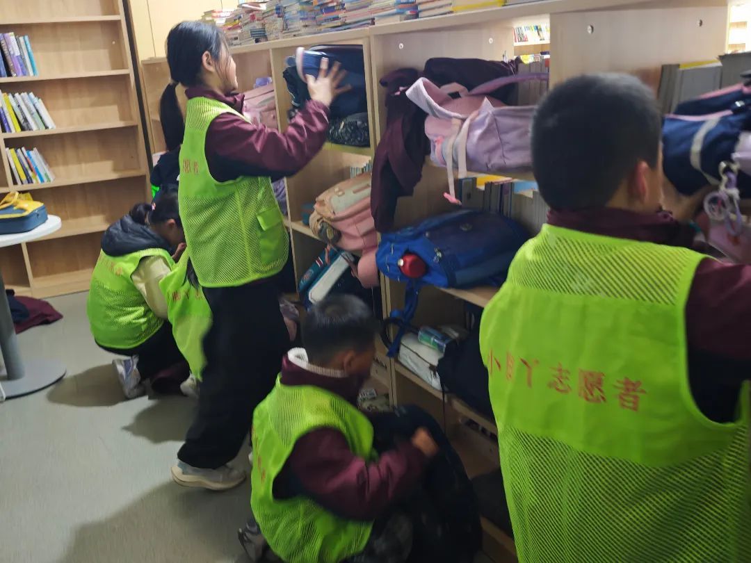 ▲永丰小学的小雷锋们活跃在课后服务的志愿服务中。他们为在图书馆进行书香阅读的弟弟妹妹们整理书包、柜架、桌椅,为参与校级看护的同学们营造温馨、舒适的阅读空间。