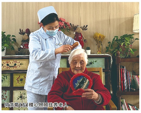 如今,从钢铁企业行车工转行福利机构护理员已是第6个年头了,虽然两个行业的专业技能截然不同,但在何洪菊看来,两者都需要责任感、耐心和细心。行车工面对的是冰冷的机器,鲜少与人沟通,而现在,她们的服务对象是需要照护的老人,每当听到住养老人那句“小何,侬明朝还来吗”的询问时,她总是心头一暖,护理员的温情不断在老人和护理员之间传递。
