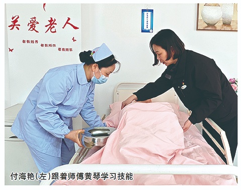 尽管已是技能傍身,但第一次看到师傅“查岗”,付海艳还是不免慌张。那天,正准备给卧床老人翻身的付海艳发现,师傅正默默站在她身后,观察她的动作是否标准。付海艳一边紧张地做着拖、移、扶、翻等动作,一边等师傅发话。等她的动作停下来,师傅才逐条指出动作的疏漏点。