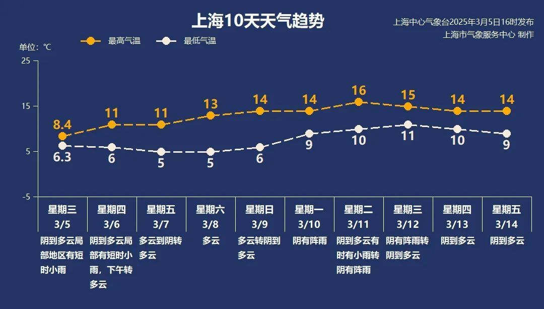 周五和双休日,上海以多云或阴的天气为主,阳光出勤率增加,气温逐日回升,最低气温在5~6℃,最高气温在11~14℃之间。下周初暖湿气流再度活跃起来,新一轮阴雨天气回归。气温上升的趋势保持,也释放着春天将至的信号。提醒大家关注最新天气预报信息,合理安排生活及出行。