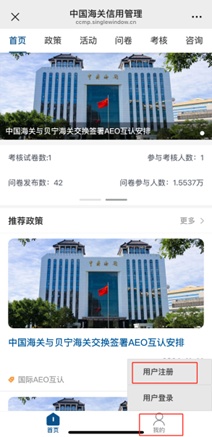 在微信公众平台手机端首页,点击【我的】-【用户注册】。