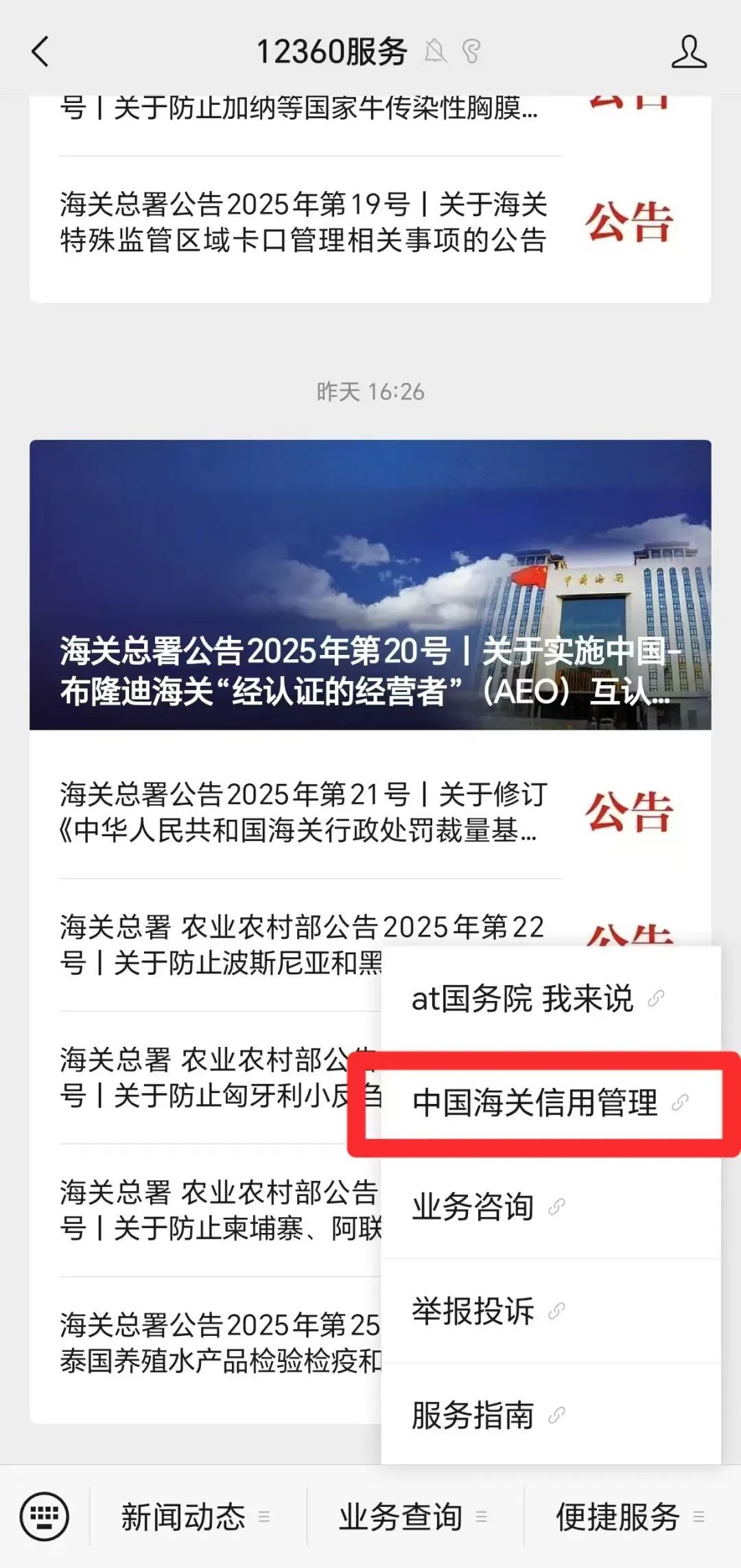 点击“12360服务”微信公众号下面的“便捷服务—中国海关信用管理”按钮。