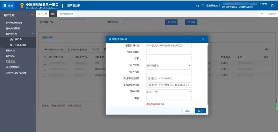 新增企业操作员账号:使用“单一窗口”用户管理系统,找到“操作员信息”功能模块,按指引录入操作员信息。