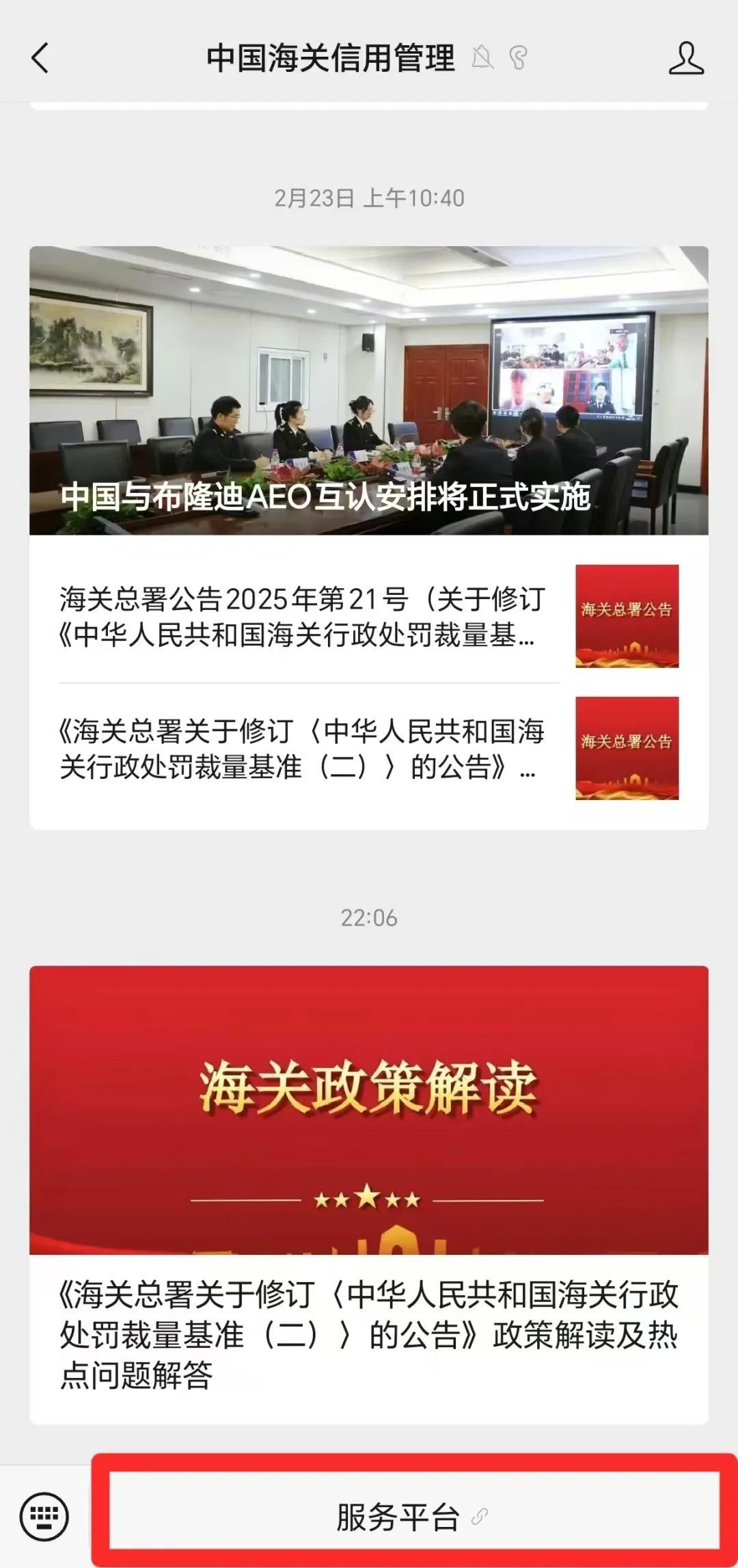 点击“中国海关信用管理”微信公众号下面的“服务平台”按钮即可进入。