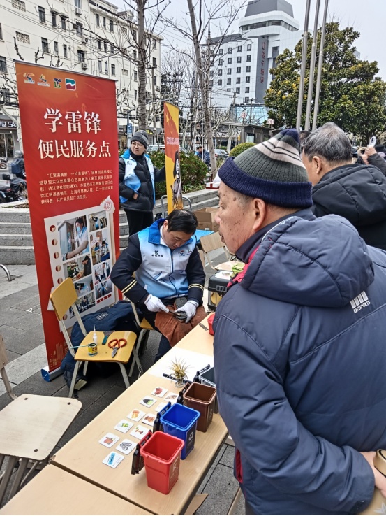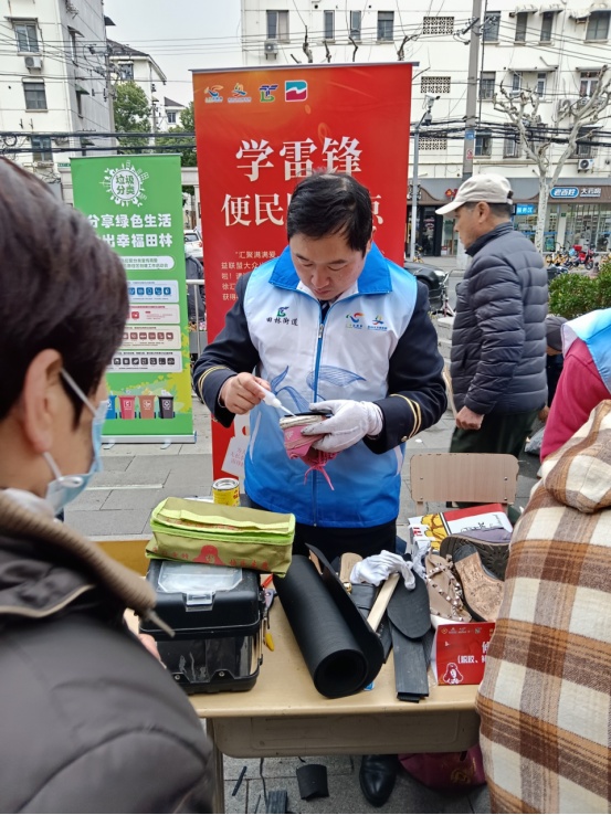 在田林路街道的学雷锋活动现场,大众出租驾驶员彭广兵师傅一早支起了摊位,为社区居民提供修鞋、科普垃圾分类知识等公益服务。小交了解到,彭师傅和爱人参与社区志愿服务已经十余年了。